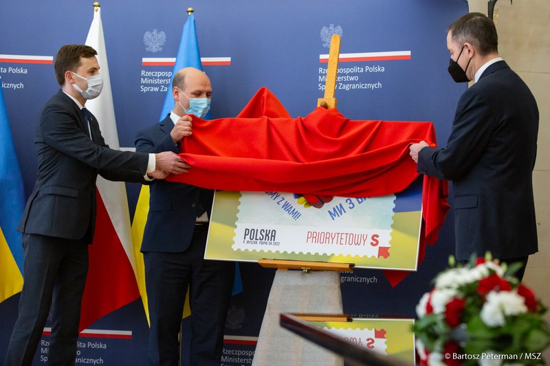 - Najazd Rosji na Ukrainę zburzył spokój na świecie. Zmienił życie nas wszystkich, a nade wszystko los obywateli Ukrainy. Polacy doświadczyli wojny, wiedzą jak szybko niweczy ona dokonania pokoleń i jak głębokie rany zostawia – powiedział w czasie prezentacji nowego znaczka Szymon Szynkowski vel Sęk, wiceszef polskiej dyplomacji. - Może właśnie dlatego, że mamy w pamięci bolesne doświadczenie wojen XX wieku, naturalnym odruchem Polski i Polaków wobec Ukrainy i Ukraińców jest bezwarunkowa solidarność i wsparcie. Ich symbolem są ściskające się dłonie, widoczne zna znaczku - podkreślił.