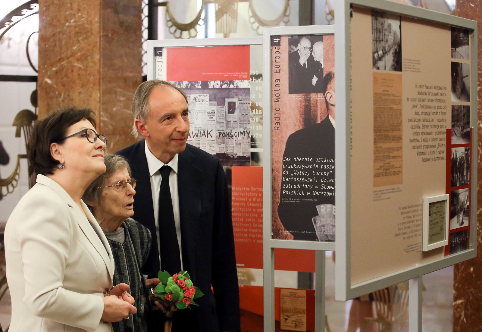 Na zdjęciu: Warszawa, 18.09.2015. Premier Ewa Kopacz (L) oraz żona i syn Władysława Bartoszewskiego - Zofia Bartoszewska (C) i Władysław Teofil Bartoszewski (P) podczas zwiedzania, otwartej 18 bm. w KPRM wystawy poświęconej zmarłemu w kwietniu br. byłemu ministrowi spraw zagranicznych Władysławowi Bartoszewskiemu.