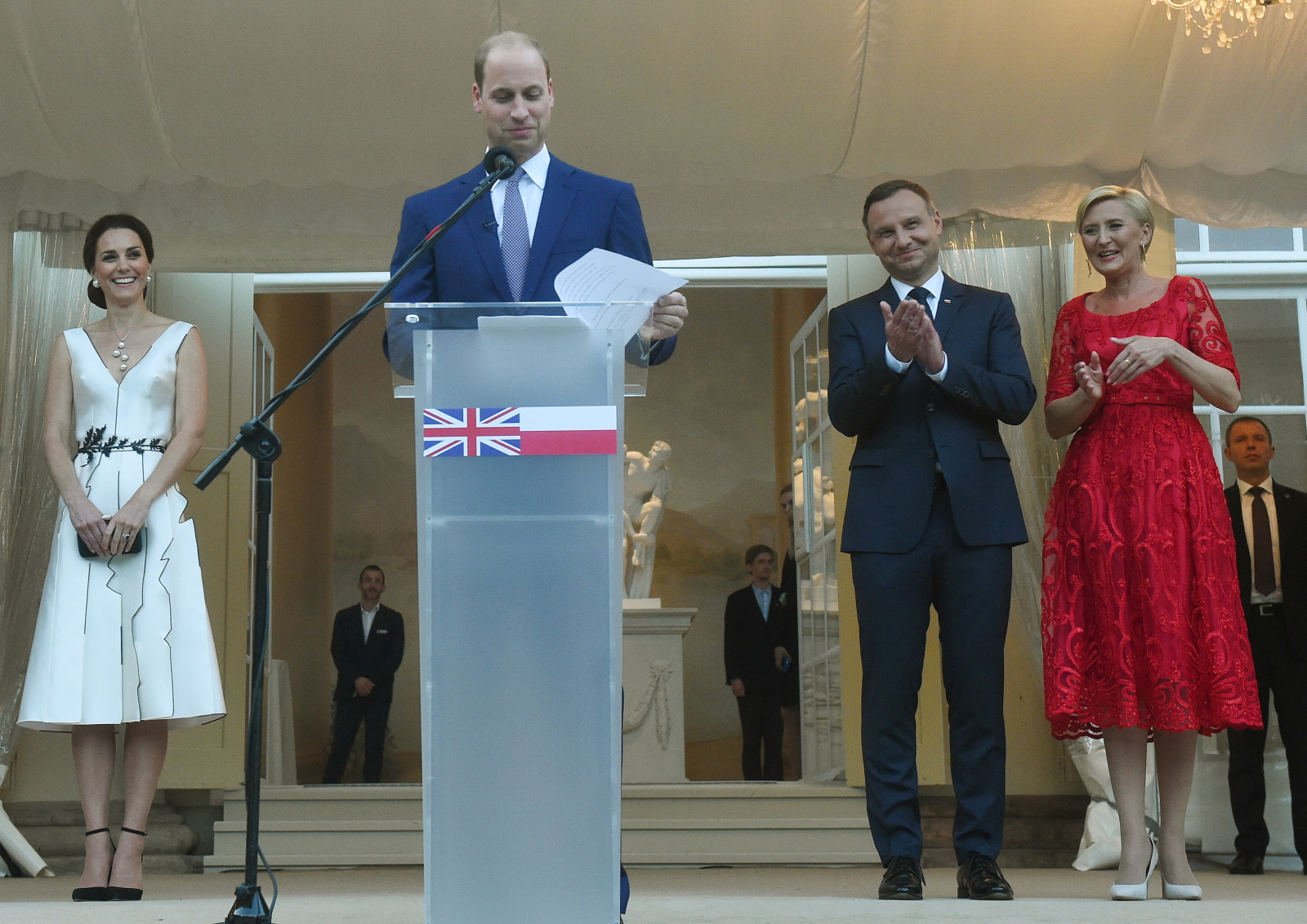 Książę Cambridge podkreślił, że Polska i Wielka Brytania mają co świętować: "Jesteśmy partnerami w NATO i po raz pierwszy od drugiej wojny światowej brytyjskie oddziały stacjonują w Polsce". Zwrócił uwagę, że język polski jest drugim najczęściej słyszanym w Wielkiej Brytanii – wychowywane są też tam dzieci, które czują się jednocześnie Polakami i Brytyjczykami. Dziękował za ciepłe powitanie w Polsce, a parze prezydenckiej za gościnę.