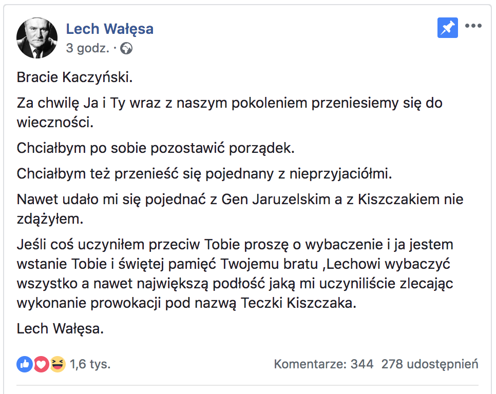 Swój wpis Wałęsa zaczął od słów "Bracie Kaczyński". "Za chwilę Ja i Ty wraz z naszym pokoleniem przeniesiemy się do wieczności. Chciałbym po sobie pozostawić porządek. Chciałbym też przenieść się pojednany z nieprzyjaciółmi" - brzmi wpis b. prezydenta. Wałęsa napisał też, że udało mu się pojednać z gen. Jaruzelskim, "a z Kiszczakiem nie zdążył".