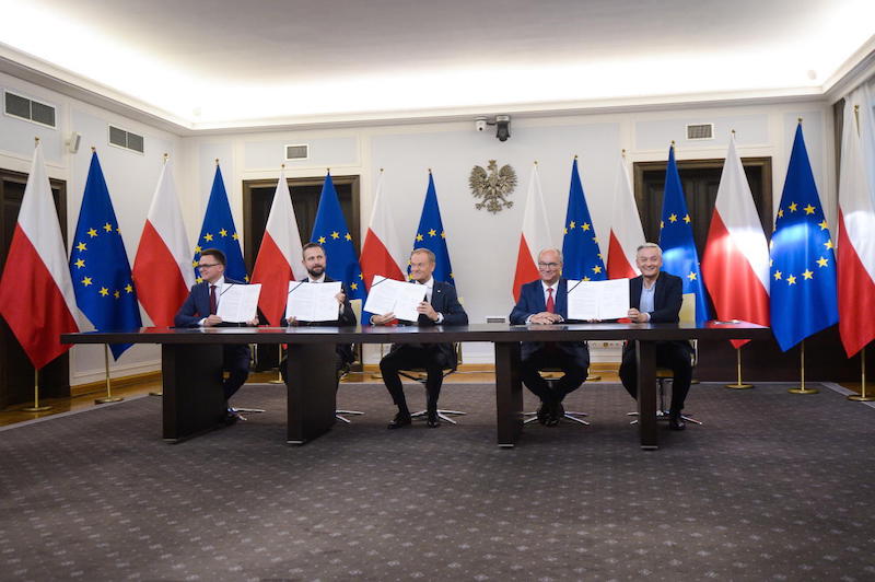 W piątek lider KO Donald Tusk, szef Polski 2050 Szymon Hołownia, prezesa PSL Władysława Kosiniaka-Kamysza oraz współprzewodniczący Nowej Lewicy: Włodzimierz Czarzasty i Robert Biedroń parafowali umowę koalicyjną. Jesteśmy gotowi do wzięcia odpowiedzialności za nasza ojczyznę i za najbliższe lata - oświadczył Tusk.