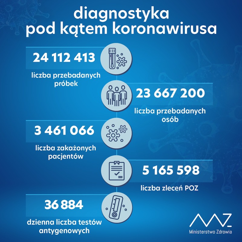 Łącznie od 4 marca ub.r., gdy wykryto w Polsce pierwsze zakażenie SARS-CoV-2, potwierdzono 3 461 066 przypadków. Zmarło 82 607 osób z COVID-19.