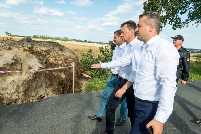 Na zdjęciu: Minister spraw wewnętrznych i administracji Mariusz Błaszczak, wojewoda kujawsko-pomorski Mikołaj Bogdanowicz i sekretarz stanu w MON Bartosz Kownacki podczas wizyty w Mąkowarsku oglądają szkody wyrządzone przez nawałnicę, która przeszła przez Polskę w nocy z 11 na 12 sierpnia.