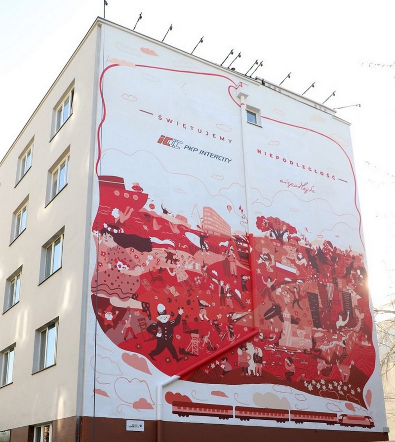 PKP Intercity postanowiło uczcić 100-lecie odzyskania przez Polskę niepodległości w wyjątkowy sposób. Na warszawskim Powiślu powstał mural, który przez najbliższy rok będzie zdobił okolicę. Przedstawia on, jak Polacy świętują swoją niepodległość.