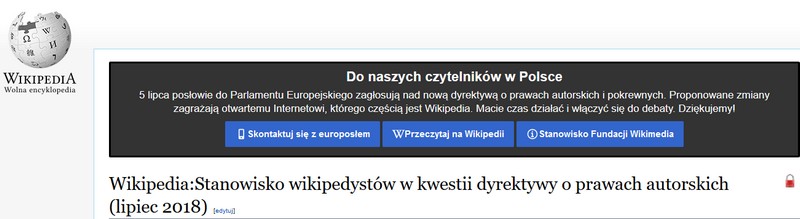 Po godzinie 15 w środę po wejściu na polską wersję Wikipedii widoczny jest komunikat, w którym czytamy m.in., że aktualna treść dyrektywy dyskutowanej w Parlamencie Europejskim nie aktualizuje prawa autorskiego w Europie i nie promuje uczestnictwa w społeczeństwie obywatelskim, a zagraża wolności online i tworzy przeszkody w dostępie do sieci. Autorzy komunikatu, podpisani jako "współtwórcy Wikipedii", twierdzą również, że dyrektywa wprowadza nowe ograniczenia, filtry i restrykcje. Poniżej tekstu znajduje się również link do tekstu z gotowym apelem do członków Parlamentu Europejskiego, który może wysłać każdy internauta.