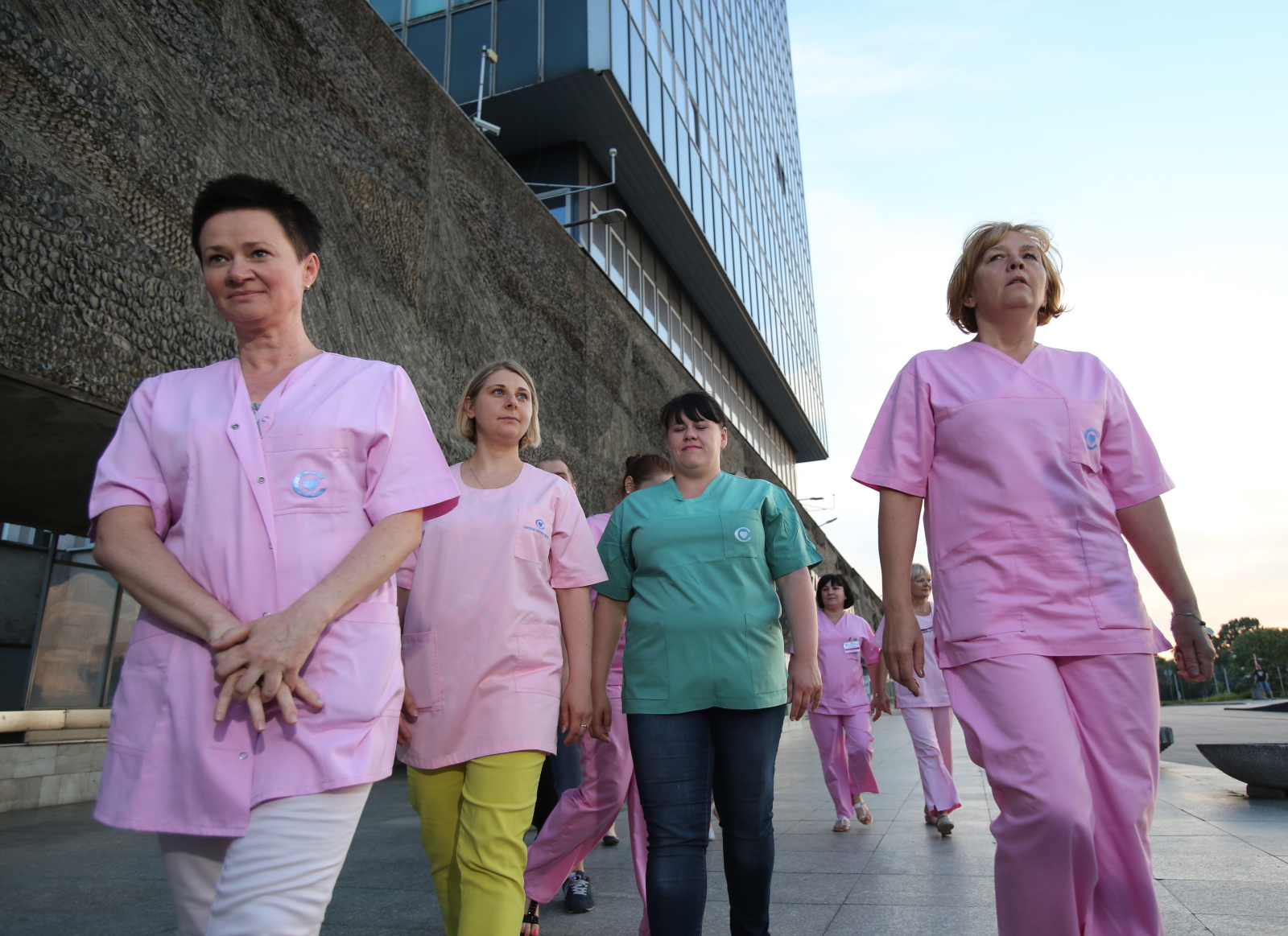 Na zdjęciu: Przewodnicząca Związku Zawodowego Pielęgniarek i Położnych przy CZD Magdalena Nasiłowska (z prawej) w towarzystwie strajkujących pielęgniarek przed Centrum Zdrowia Dziecka