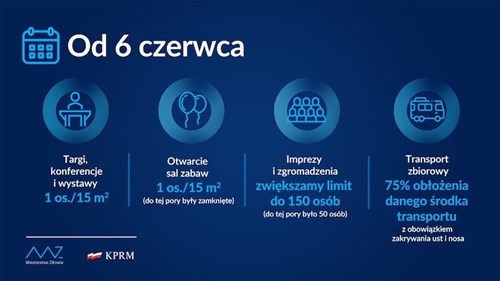 Poinformował również o zmianach, jeśli chodzi o imprezy i zgromadzenia. "Mówimy tu o weselach, oczywiście o zgromadzeniach też publicznych. Od 6 czerwca zwiększamy ten limit do 150 osób. Do tej pory ten limit wynosił 50 osób" - dodał minister zdrowia.