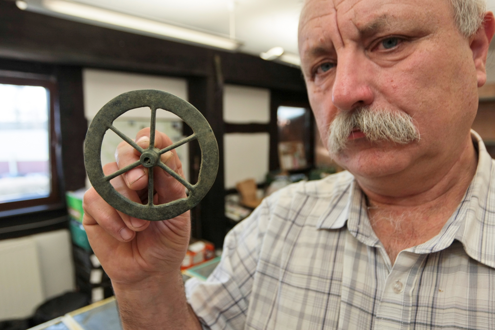 Na zdjęciu: Stanisław Sinkowski z Muzeum Lubuskiego im. Jana Dekerta w Gorzowie Wielkopolskim, prezentuje koło z wózka rytualnego.