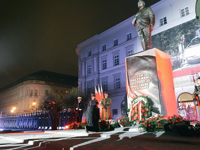 Przed siedzibą Dowództwa Garnizonu Warszawa przy pl. Józefa Piłsudskiego w Warszawie odsłonięto w sobotę pomnik prezydenta Lecha Kaczyńskiego. Pomnik odsłonili wspólnie prezydent Andrzej Duda, prezes PiS Jarosław Kaczyński oraz Marta Kaczyńska - córka Lecha Kaczyńskiego.