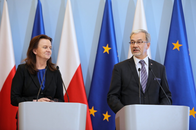 Na zdjęciu: Minister inwestycji i rozwoju Jerzy Kwieciński oraz prezes ZUS Gertruda Uścińska podczas konferencji prasowej dotyczącej OFE