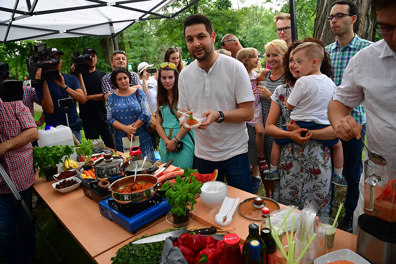 Kandydat na prezydenta stolicy wraz z burmistrzem Bemowa Michałem Grodzkim oraz radnym dzielnicy Adamem Niedziałkiem (PiS) ugotowali dla uczestników wegańskie i bezglutenowe potrawy: chłodnik pomidorowo-arbuzowy i potrawkę z soczewicy z ryżem. Do picia zaproponowali smoothie zrobione m.in. z wody mineralnej, mięty, jarmużu i nasion chia. Jak wyjaśnił Jaki, menu ułożyła jego żona Anna. - Te potrawy mają być bezglutenowe, mają dawać dużo siły, energii i jednocześnie być mało kaloryczne - podkreślił.