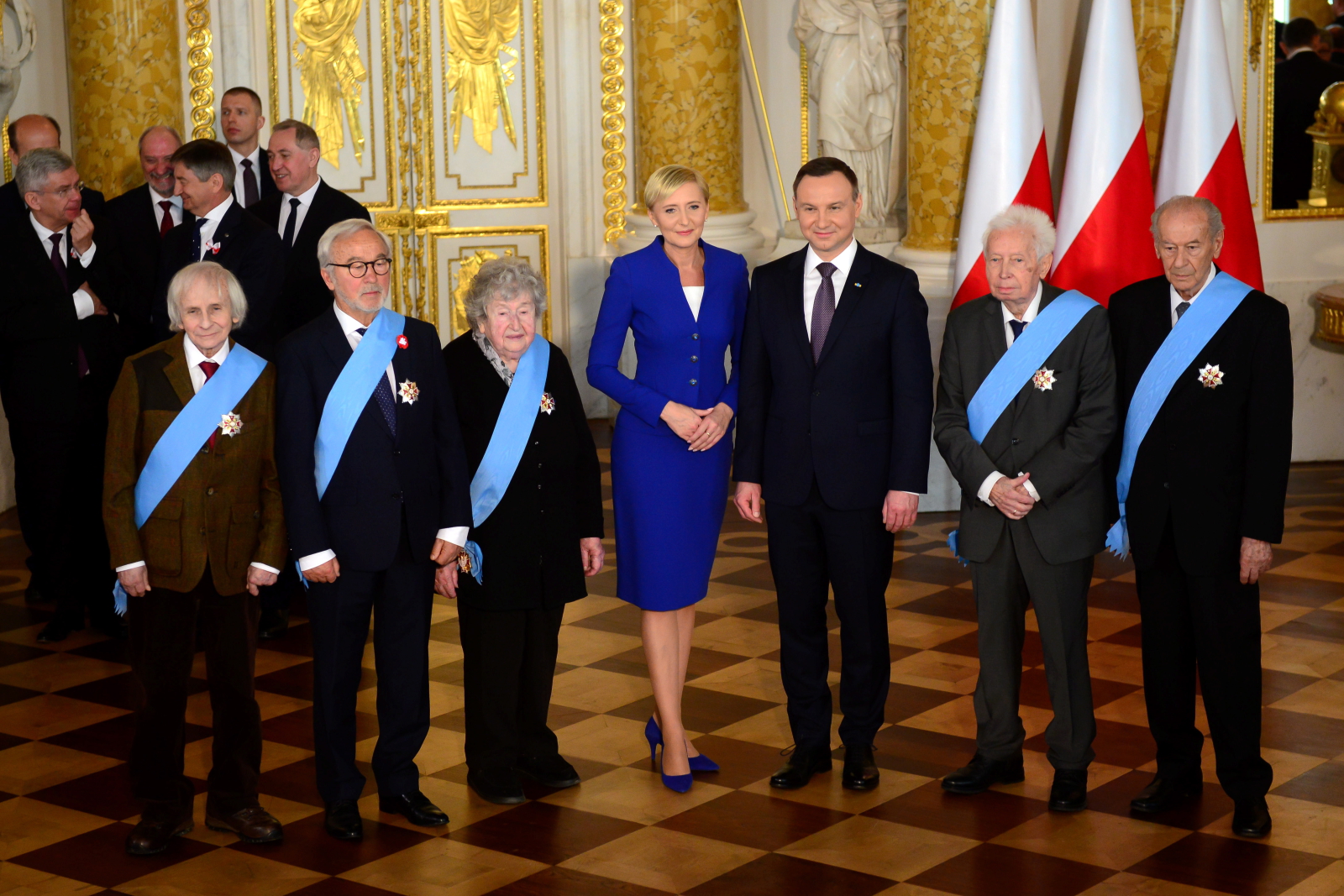 Na zdjęciu: Para prezydencka oraz odznaczeni Orderem Orła Białego: Jan Krzysztof Kelus, Adam Bujak, Zofia Mertens, Mieczysław Chorąży i Mieczysław Tomaszewski pozują do wspólnego zdjęcia po uroczystości wręczenia odznaczeń.