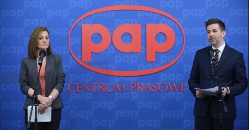 Prezes Urzędu Ochrony Danych Osobowych Edyta Bielak-Jomaa oraz dyrektor Zespołu Analiz i Strategii w Urzędzie Ochrony Danych Osobowych Piotr Drobek podczas briefingu poświęconego nałożeniu pierwszej administracyjnej kary pieniężnej za naruszenie przepisów o ochronie danych osobowych