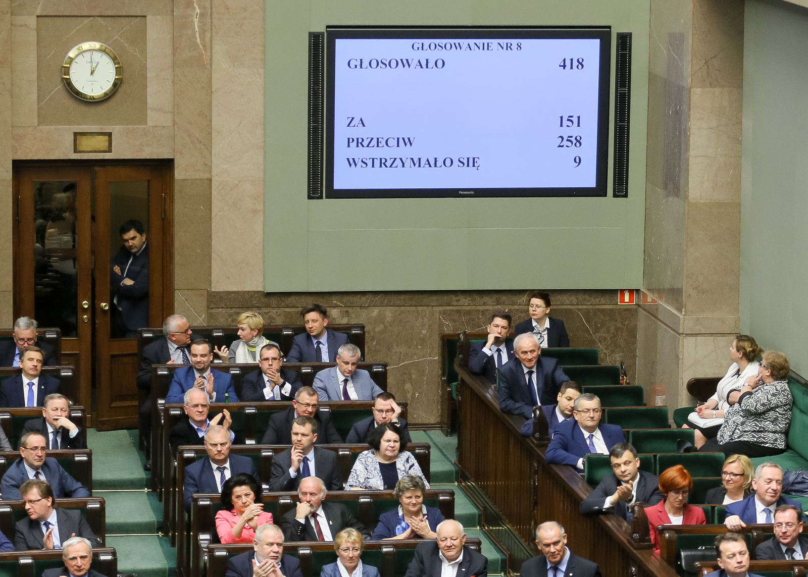 Na zdj.: Wyniki głosowania nad wnioskiem o odrzucenie przedstawionego przez Radę Ministrów raportu o rządach PO-PSL, podczas posiedzenia Sejmu w nocy z 11 na 12 bm. Sejm nie zgodził się na odrzucenie raportu.PAP/Paweł Supernak