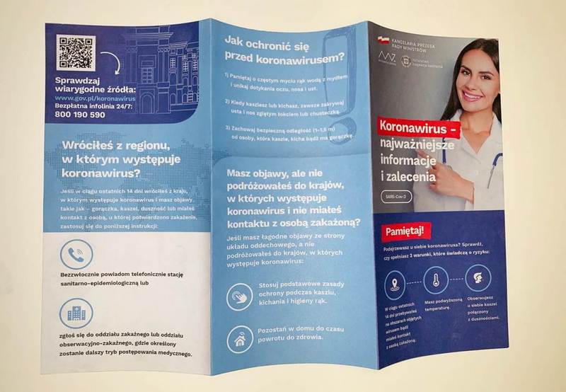 Blisko 15 milionów gospodarstw domowych otrzyma ulotki z informacjami o postępowaniu w przypadku zetknięcia z koronawirusem. Dystrybucją druków zajmie się Poczta Polska.