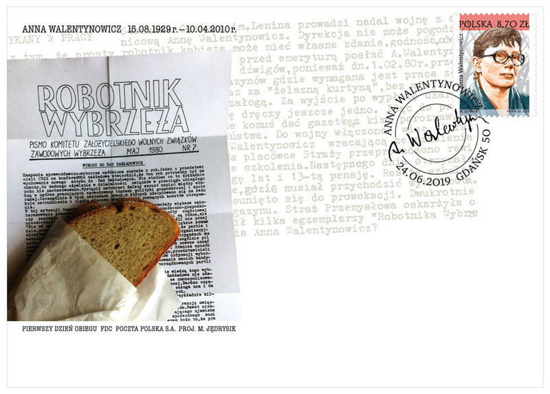 Oprócz okolicznościowego znaczka Poczta Polska wypuściła, w limitowanej wersji, kopertę FDC, czyli wydawaną w pierwszym dniu obiegu znaczków. Widnieje na niej wizerunek Anny Walentynowicz oraz grafika przedstawiająca jeden z numerów „Robotnika Wybrzeża”, pisma Komitetu Założycielskiego Wolnych Związków Zawodowych Wybrzeża z ułożoną na wierzchu kromką chleba. Periodyk wydawany był nieregularnie od sierpnia 1978 do maja 1980 r. Walentynowicz wchodziła w skład redakcji tej gazety.