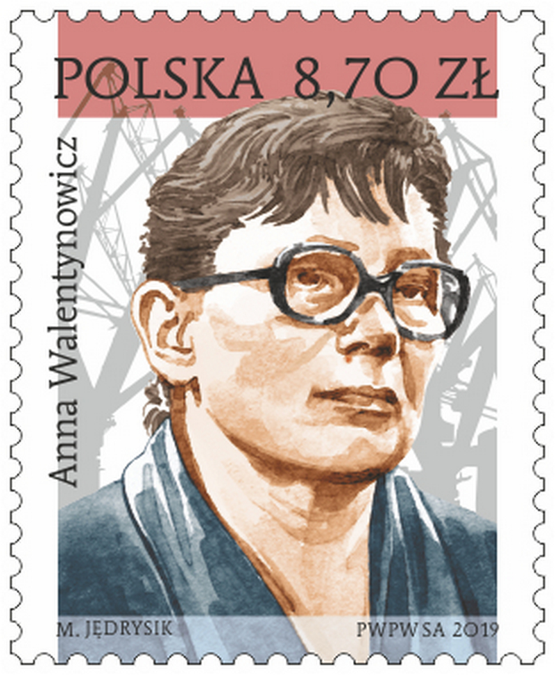 Znaczek obiegowy z wizerunkiem Anny Walentynowicz, przedstawionej na tle stoczniowych dźwigów, został wprowadzony do obiegu w nakładzie 1 mln sztuk. Jego autorem jest Maciej Jędrysik.