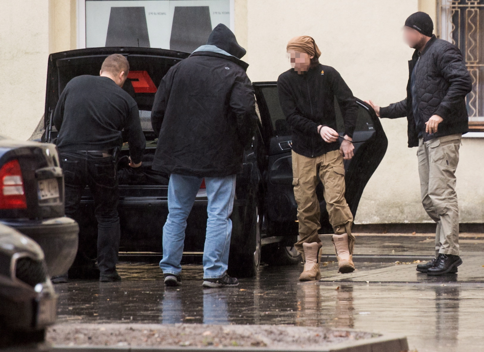 Na zdj. Mężczyzna (2P), zatrzymany w związku ze śledztwem dotyczącym działalności o charakterze terrorystycznym, został przewieziony 15 bm. przez funkcjonariuszy Agencji Bezpieczeństwa Wewnętrznego do policyjnej izby zatrzymań w Łodzi. Czynności z udziałem Polaka zostaną przeprowadzone w łódzkiej prokuraturze apelacyjnej w ciągu najbliższych dni.