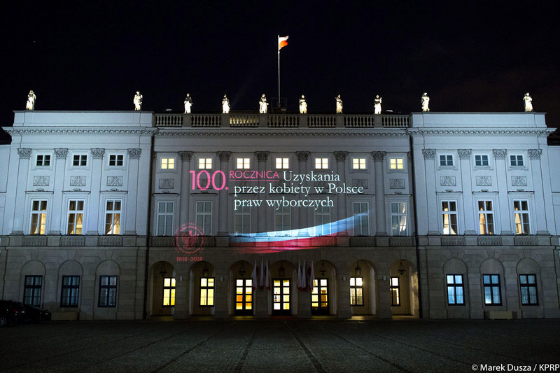 Sto lat temu, 28 listopada 1918 roku Józef Piłsudski wydał dekret o ordynacji wyborczej stanowiący, że wyborcą Sejmu jest każdy obywatel „bez różnicy płci”, który do dnia ogłoszenia wyborów ukończył 21 lat oraz wybieralni do Sejmu są wszyscy obywatele (obywatelki) państwa posiadający czynne prawo wyborcze. Z tej okazji na fasadzie Pałacu Prezydenckiego została wyświetlona okolicznościowa iluminacja.