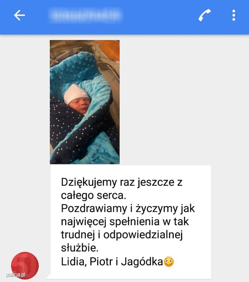 Ten skierował na miejsce dwie policyjne załogi, które eskortowały samochód z rodzącą do samego szpitala. Krótko po tym, na świat przyszła Jagódka i SMS od jej rodziców z podziękowaniami dla policjantów.
