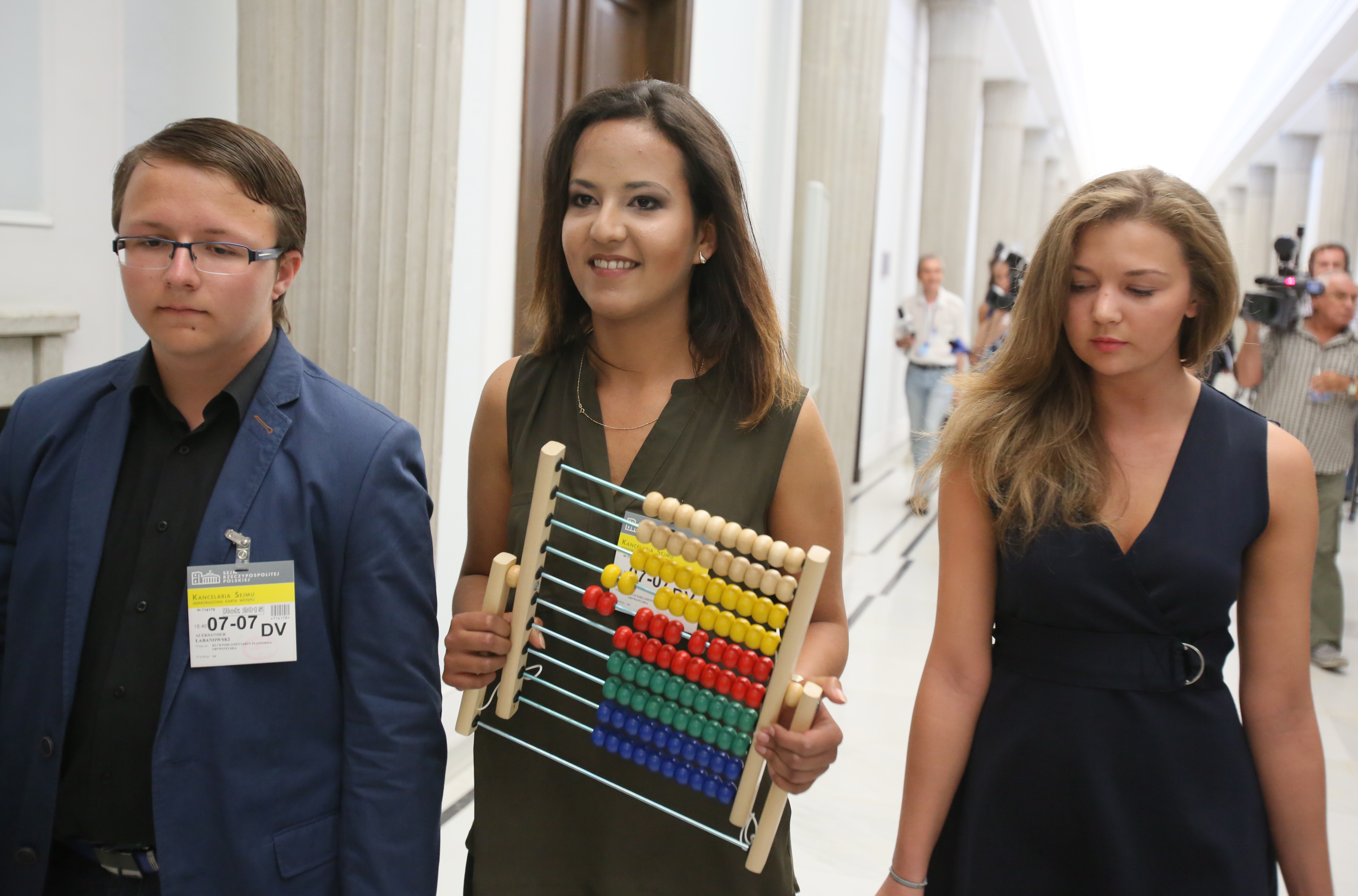 Na zdjęciu: Działacze młodzieżówki PO chcieli wczoraj po południu wręczyć Beacie Szydło drewniane liczydło, aby - ja mówili - "raz jeszcze mogła policzyć ile będą kosztowały jej obietnice, tak aby nie doprowadziła polskiego państwa do bankructwa". W sytuacji, gdy nie udało im się spotkać Szydło w Sejmie, działacze MD zanieśli liczydło do znajdującego się kilka pokoi dalej gabinetu szefa klubu PiS Mariusza Błaszczaka. Fot. PAP/Leszek Szymański