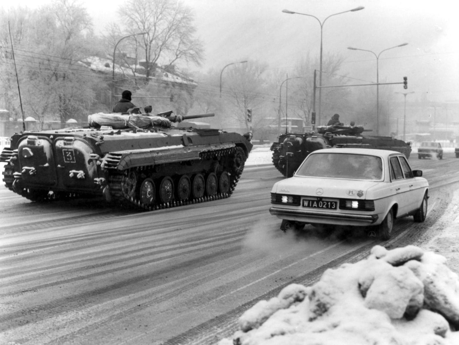 Na zdjęciu archiwalnym z grudnia 1981: czołgi i samochody osobowe na ulicach Warszawy.