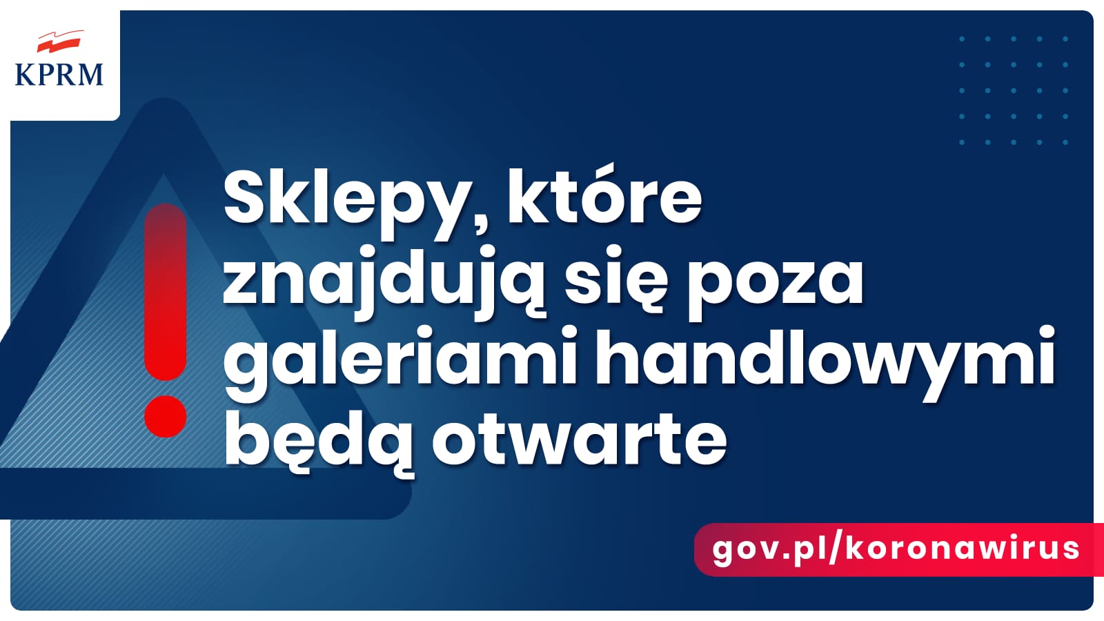 • Wszystkie sklepy oferujące sprzedaż ubrań, biżuterii, kosmetyków, narzędzi i wszelkich innych towarów pozostają otwarte. Ograniczenie dotyka jedynie tych punktów, które znajdują się w centrach lub galeriach handlowych. W galeriach i centrach handlowych zaś otwarte będą wszystkie: sklepy spożywcze, apteki,drogerie, pralnie.