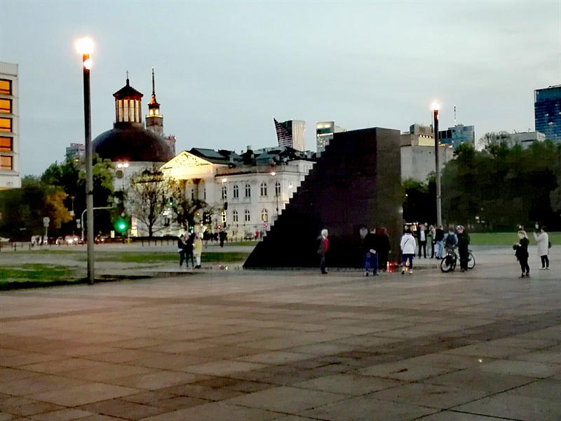 Schodzimy z córcią z placu Piłsudskiego w stronę Krakowskiego Przedmieścia. Jest akurat ten moment dnia, który my nazywamy zmierzchem, ale lepsze określenie mają Anglicy – twilight. Obracamy się, żeby jeszcze raz spojrzeć na pomnik. W tle dyskretnie kokietuje Narodowa Galeria Sztuki, dalej iglica PEKiN-u i „Żagiel” Libeskinda. Jest, jak być powinno.