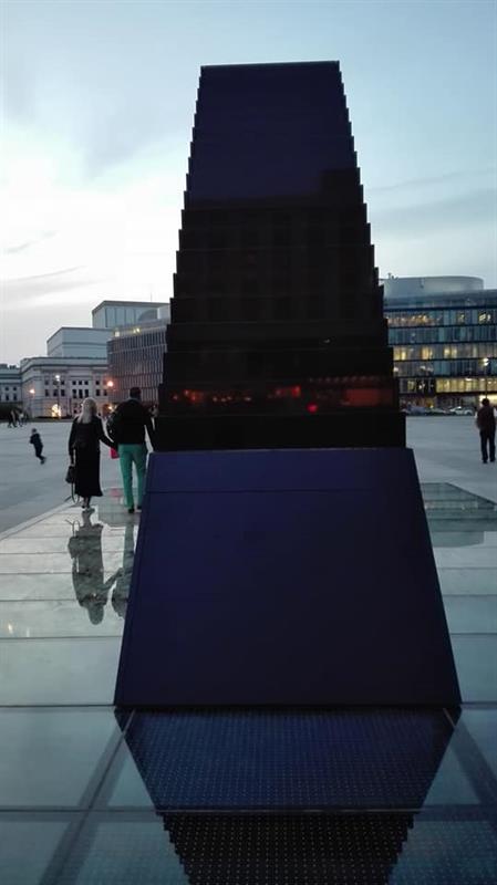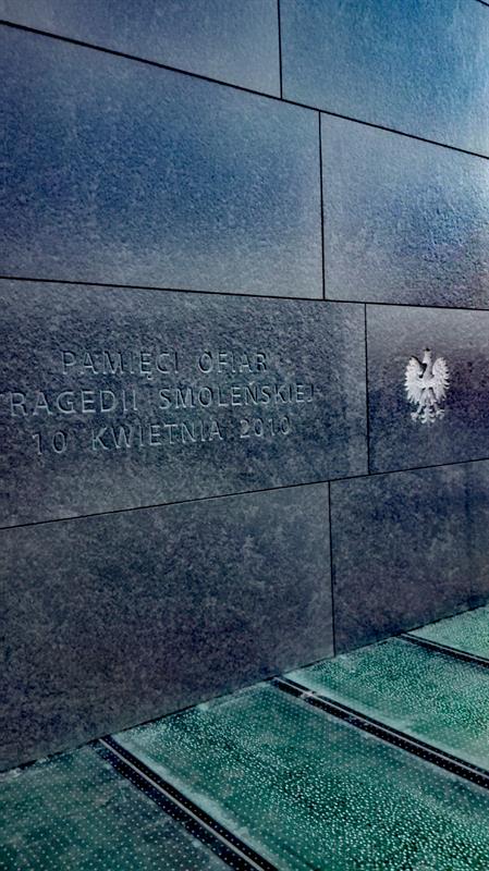 Pomnik spokojny, minimalistyczny, elegancki. Charakterystyczne pomarańczowe hotelowe okna odbijają się w jego bryle, dając wrażenie zapalonych świec. Wokół monumentu ułożono szklane płyty. Widać przez nie wielki dół, rozkopaną ziemię. Trochę jakby zaglądać do grobu… Grobu, w którym jaśnieje 96 światełek. Dość nieoczekiwanie dało to efekt „oswajania” najmłodszych z budowlą – zaciekawione dzieciaczki na czworakach i z nosami szorującymi po szkle, piszcząc z radości, okrążają pomnik. Dorośli przeważnie milczą. Zapalają znicze, kładą kwiaty, ale oczywiście przede wszystkim fotografują. Na szczęście radiowóz z policjantami pilnującymi pomnika smoleńskiego wycofano z bezpośredniego sąsiedztwa monumentu pod budynek Garnizonu Warszawa.