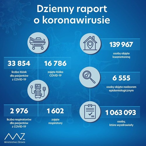 Liczba zakażonych koronawirusem od poczatku epidemii w Polsce to 1 318 562, z czego 29 119 osób zmarło. Wyzdrowiały 1 063 093 osoby.