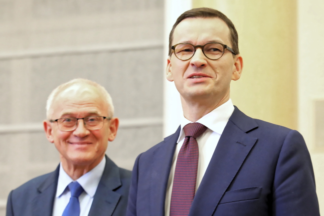 Na zdjęciu: premier Mateusz Morawiecki i minister energii Krzysztof Trzórzewski podczas konferencji prasowej w KPRM w Warszawie