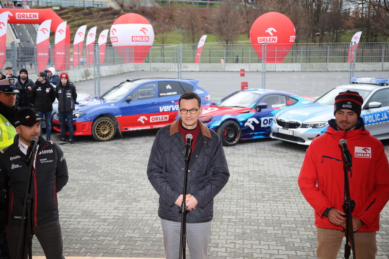 Na zdjęciu: od lewej Kajetan Kajetanowicz, premierMateusz Morawiecki i Jakub Przygoński podczas akcji edukacyjnej #DobryKierowca z okazji wydarzenia motoryzacyjnego połączonego z prezentacją nowych zasad bezpieczeństwa ruchu drogowego.