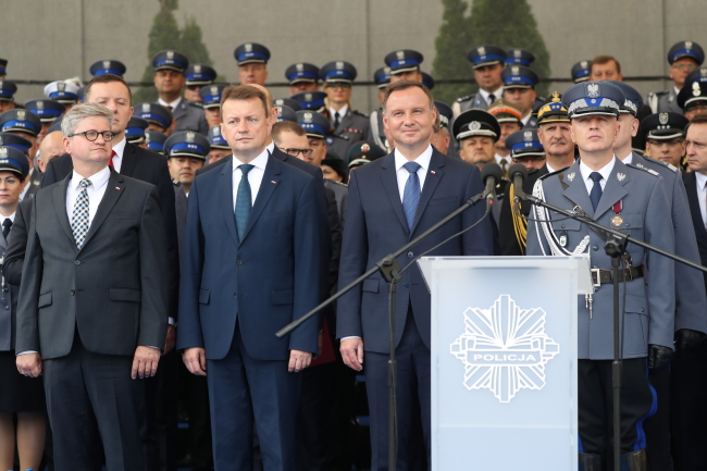 Zwracając się do policjantów szef MSWiA Mariusz Błaszczak podkreślił, że najważniejsze w ich misji jest pojęcie służby, etos służby. Minister podziękował policjantom za pracę przy ubiegłorocznych Światowych Dniach Młodzieży oraz szczycie NATO, a także za zapewnienie bezpieczeństwa podczas niedawnej wizyty prezydenta USA Donalda Trumpa.