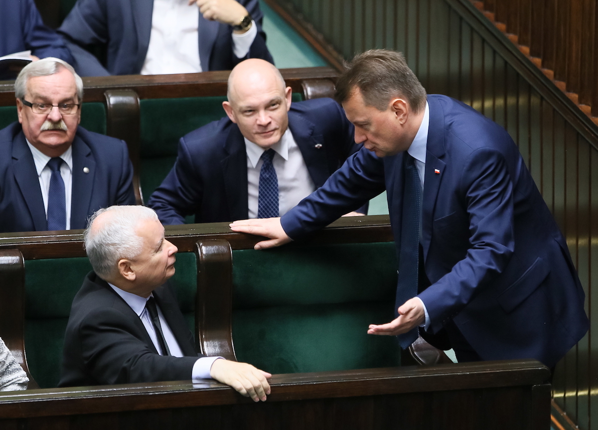 Na zdjęciu: Prezes PiS Jarosław Kaczyński oraz minister spraw wewnętrznych i administracji Mariusz Błaszczak na sali obrad Sejmu.