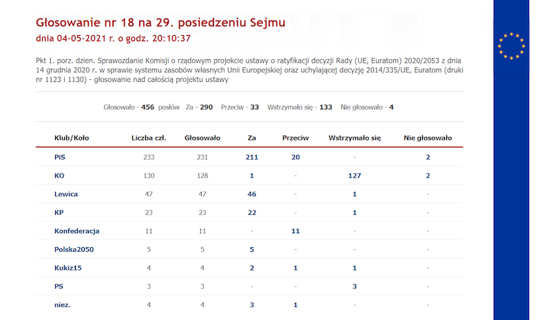 Sejm przyjął we wtorek wieczorem ustawę w sprawie ratyfikacji przez prezydenta decyzji Rady Europejskiej o zwiększeniu zasobów własnych Unii Europejskiej. Za Funduszem Odbudowy było 290 posłów, przeciw 33, a 133 wstrzymało się. Jeszcze przed głosowaniem wicepremier Zbigniew Ziobro zapewniał, że Solidarna Polska nie poprze projektu. I słowa dotrzymał. Brakujące głosy premierowi Mateuszowi Morawieckiemu zapewniły partie opozycyjne. Teraz ustawa trafi do Senatu.