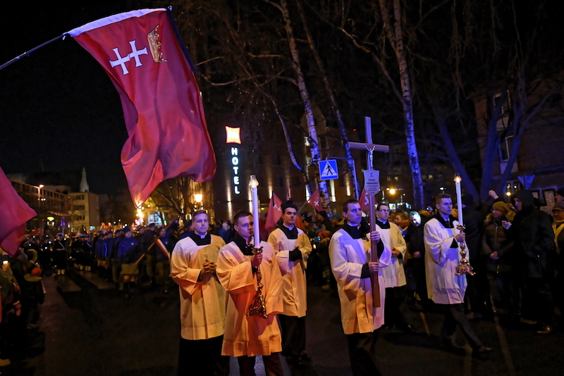 Trumna jest przewożona karawenem. Kondukt tworzą m.in. przedstawiciele różnych służb, z których część przyniosła ze sobą sztandary - jest ich około 200; są przedstawiciele organizacji pozarządowych, grup rekonstrukcyjnych.