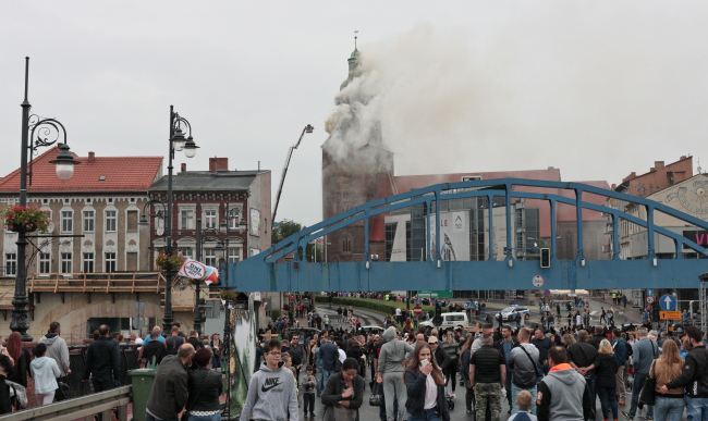 Ponad 20 zastępów strażaków walczy z pożarem katedry w Gorzowie Wlkp. Z dachu na wieży gotyckiej świątyni unoszą się kłęby dymu, zaczęły się też pojawiać płomienie. Strażacy są na klatce schodowej prowadzącej do wieży, próbują dotrzeć do miejsca, gdzie może być zarzewie pożaru.