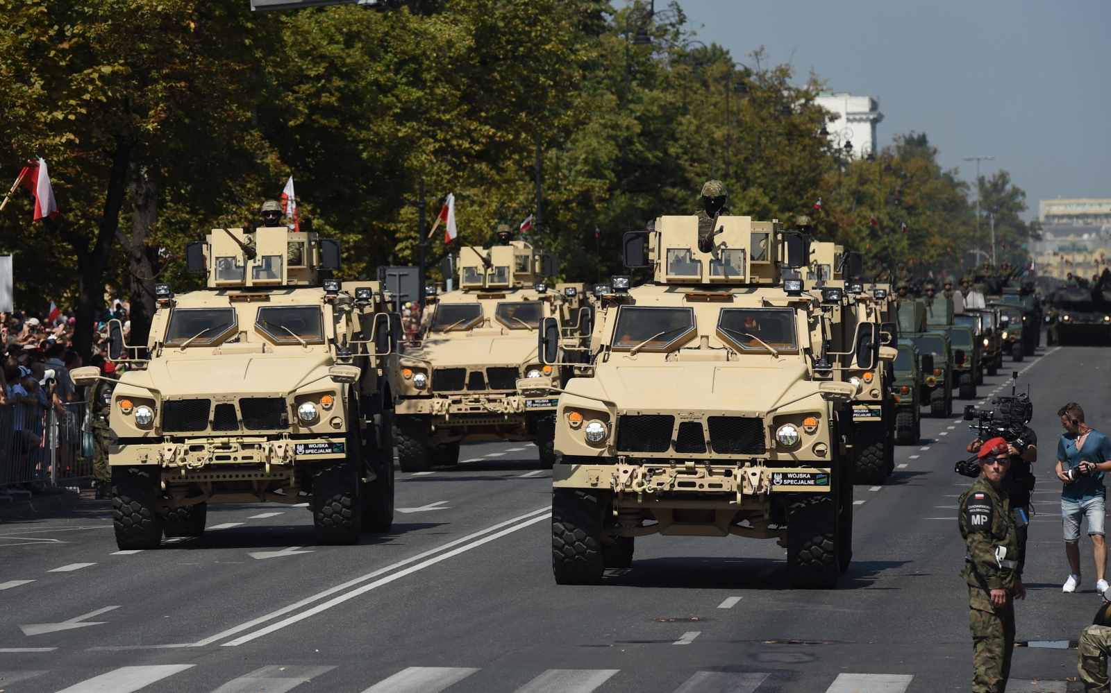 Defiladę pojazdów, bezpośrednio po przemarszu, rozpoczęły motocykle, quady, samochody, pojazdy opancerzone i przewożące bezzałogowce, należące do Wojsk Specjalnych, Wojsk Lądowych i Żandarmerii Wojskowej. Następnie w Al. Ujazdowskich zaprezentowały się kołowe transportery opancerzone Rosomak i ich odpowiedniki z USA - wozy Stryker. Później artylerzyści z radarami Liwiec, armatohaubicami Dana, wyrzutniami rakietowymi Langusta oraz - po raz pierwszy podczas parady na Święto Wojska Polskiego - wozami należącymi do Morskiej Jednostki Rakietowej (do niedawna Nadbrzeżnego Dywizjonu Rakietowego). Przejazd zakończyły pojazdy należące do przeciwlotników, saperów i sanitariuszy.