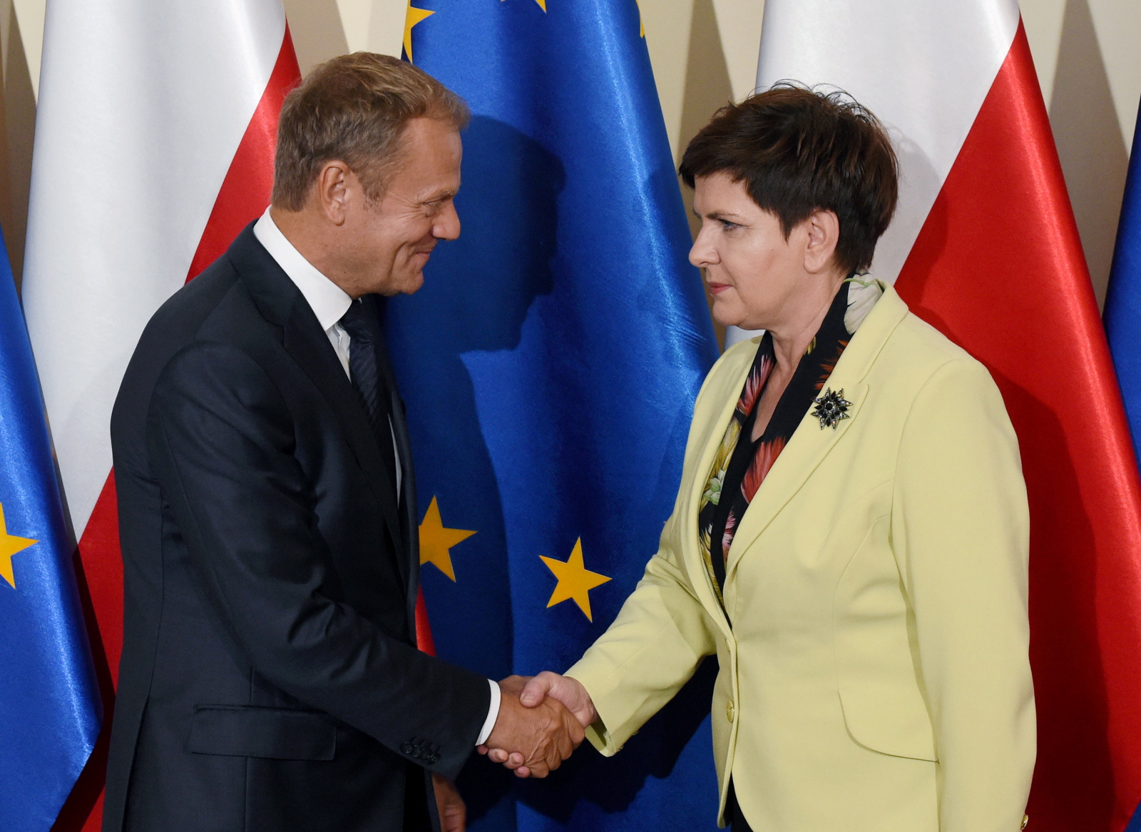 Na zdjęciu: Premier Beata Szydło i przewodniczący Rady Europejskiej Donald Tusk podczas spotkania w KPRM. Tusk odwiedza unijne stolice w ramach konsultacji przed piątkowym nieformalnym szczytem UE w Bratysławie.