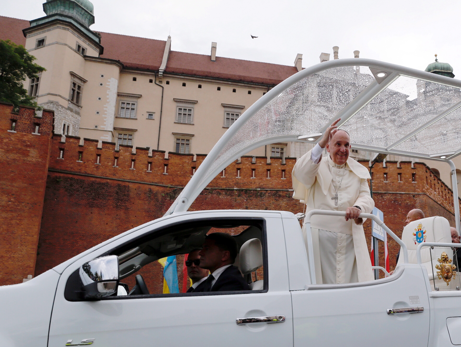 Na zdjęciu: papież Franciszek w papamobile pozdrawia wiernych podczas przejazdu na Wawel, 27 bm., gdzie odbyła się ceremonia oficjalnego powitania. XXXI Światowe Dni Młodzieży połączone z pielgrzymką papieża Franciszka do Polski, potrwają do 31 lipca. (mr)