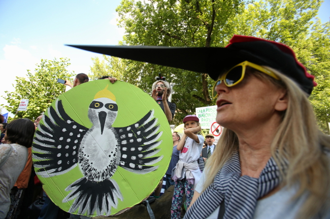 Na zdjęciu: Pokojowa demonstracja zorganizowana przez koalicję Kocham Puszczę pod hasełem "UNESCO! Powstrzymaj wycinkę Puszczy Białowieskiej!" przed Centrum Kongresowym ICE w Krakowie.