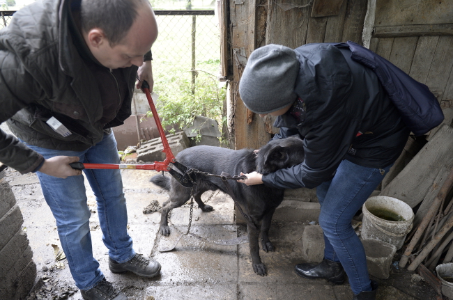 Weterynarz Radosław Fedaczyński przecina łańcuch, na którym przetrzymywano psa na terenie jednego z ogródków działkowych w Przemyślu.