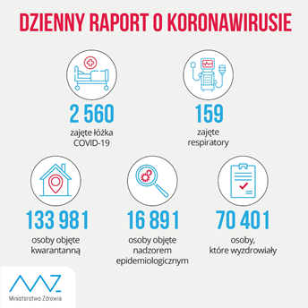 Resort zdrowia informuje też o tym, że na COVID-19 zmarła 1 osoba (wiek-płeć, miejsce zgonu): 92-K Łódź.