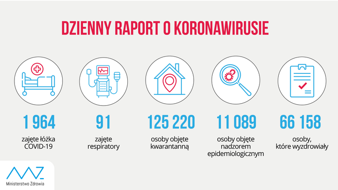 Liczba osób zakażonych koronawirusem od początku epidemii w Polsce: 82 809. Zmarło 2 369 osób. Wyzdrowiało 66 158.