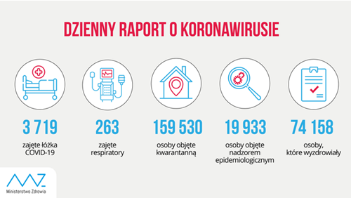 Resort zdrowia informuje także, że z powodu COVID-19 zmarły 2 osoby (wiek-płeć, miejsce zgonu): 79-M Warszawa, 46-M Kraków. A z powodu współistnienia COVID-19 z innymi schorzeniami zmarło 56 osób (wiek-płeć, miejsce zgonu): 55-M, 75-M Kędzierzyn-Koźle, 67-M Opole, 71-K, 89-M Ostróda, 83-M Łuków, 61-K Tomaszów Lubelski, 67-M Krasnystaw, 62-M Raciążek, 74-K Kutno, 79-M Łódź, 90-K, 74-M, 59-K, 74-K, 88-K, 91-M, 77-K Poznań, 78-M Gliwice, 63-M Chorzów, 70-K Racibórz, 75-K Kędzierzyn-Koźle (mieszkanka woj. śląskiego), 61-M Płońsk, 79-K Sochaczew, 70-M Warszawa, 82-M Starachowice (mieszkaniec woj. mazowieckiego), 59-M Jarosław, 77-M, 73-M Przemyśl, 91-K Rzeszów, 87-M, 62-K, 8-K Łańcut, 83-K Sucha Beskidzka, 73-M, 88-K, 88-M, 85-M Nowy Sącz, 79-M, 74-M, 72-M Kraków, 46-K Izdebnik, 65-M Kraków (mieszkaniec woj. świętokrzyskiego), 81-K Starachowice, 85-M, 76-K, 75-K Końskie, 70-M Kielce, 61-M, 68-M, 73-M, 74-K, 77-M Gdańsk, 70-M Kościerzyna, 72-M Gdynia, 91-K Puck.