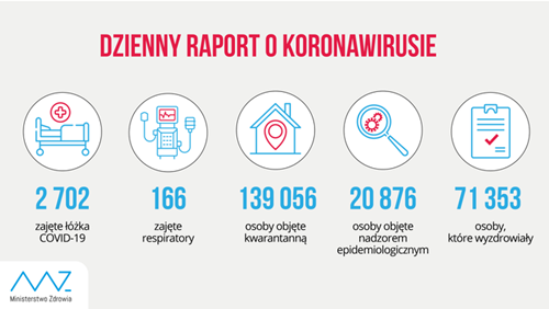Resort zdrowia informuje też o kolejnych przypadkach śmiertelnych. Z powodu COVID-19 zmarł 76-letni mężczyzna z Gdańska. A z powodu współistnienia COVID-19 z innymi schorzeniami zmarło 26 osób (wiek-płeć, miejsce zgonu): 73-M Stare Kozłowice, 69-M Nowe Miszewo, 59-M, 78-M Ostróda, 93-K, 87-M Łódź, 72-K Zielona Góra, 87-K Cieszyn, 79-M, 79-M Racibórz, 76-M Wrocław, 69-M Sanok, 83-M, 61-M, 60-M, 54-K, 79-M Poznań, 89-M Kraków, 88-M, 59-M Gdańsk, 48-M Lublin, 82-M, 58-M, 62-M, 86-M, 64-M Puławy.