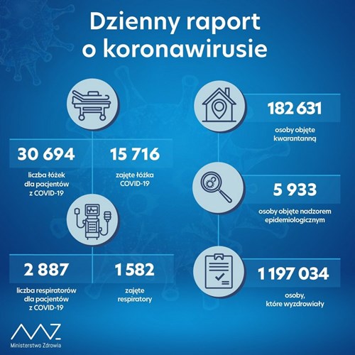 Liczba zakażonych koronawirusem w kraju (od początku pandemii): 1 443 804. Zmarło 33 698 osób. Wyzdrowiało: 1 197 034.