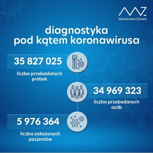 Liczba zakażonych koronawirusem od początku trwania pandemii w Polsce: 5 976 364/115 594 (wszystkie pozytywne przypadki/w tym osoby zmarłe).