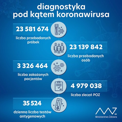 Nowe zakażenia pochodzą z województw: mazowieckiego (4836), śląskiego (2285), wielkopolskiego (1797), dolnośląskiego (1721), małopolskiego (1635), lubelskiego (1437), kujawsko-pomorskiego (1384), zachodniopomorskiego (1332), łódzkiego (1286), pomorskiego (1258), podkarpackiego (1087), warmińsko-mazurskiego (785), podlaskiego (743), lubuskiego (608), opolskiego (595), świętokrzyskiego (425).