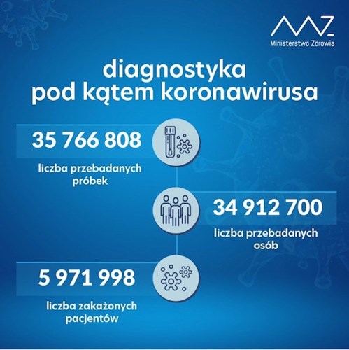 Liczba zakażonych koronawirusem od początku trwania pandemii w Polsce: 5 971 998/115 395 (wszystkie pozytywne przypadki/w tym osoby zmarłe).
